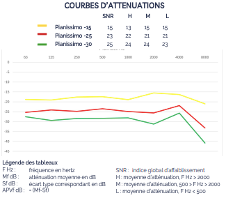 Il existe 3 niveaux d’atténuation pour les protections auditives musicales. Elles ne coupent pas le son, mais réduisent son intensité afin de préserver votre audition sans perdre la qualité d’écoute.